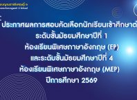 หน้าแรก ข่าวสารวิชาการ ประกาศ ผลการสอบคัดเลือกนักเรียนเข้าศึกษาต่อระดับชั้นมัธยมศึกษาปีที่ 1 และระดับชั้นมัธยมศึกษาปีที่ 4 ห้องเรียนพิเศษวิทยาศาสตร์ คณิตศาสตร์และเทคโนโลยีโดยใช้ภาษาอังกฤษเป็นสื่อ (CLIP) ปีการศึกษา 2569 ข่าวสารวิชาการประชาสัมพันธ์ ประกาศ ผลการสอบคัดเลือกนักเรียนเข้าศึกษาต่อระดับชั้นมัธยมศึกษาปีที่ 1 และระดับชั้นมัธยมศึกษาปีที่ 4 ห้องเรียนพิเศษวิทยาศาสตร์ คณิตศาสตร์และเทคโนโลยีโดยใช้ภาษาอังกฤษเป็นสื่อ (CLIP) ปีการศึกษา 2569 โดย admin - 24/02/2026 0 86 views แบ่งปันบนเฟสบุ๊ค ทวีตบนทวิตเตอร์ ประกาศผลการสอบคัดเลือกนักเรียนเข้าศึกษาต่อระดับชั้นมัธยมศึกษาปีที่ 1 CLIP >>>คลิก<<< ประกาศผลการสอบคัดเลือกนักเรียนเข้าศึกษาต่อระดับชั้นมัธยมศึกษาปีที่ 4 CLIP >>>คลิก<<< Post Views: 66 บทความที่เกี่ยวข้องเพิ่มเติมจากผู้เขียน ประกาศ ผลการสอบคัดเลือกนักเรียนเข้าศึกษาต่อระดับชั้นมัธยมศึกษาปีที่ 1 ห้องเรียนพิเศษภาษาอังกฤษ (EP)และระดับชั้นมัธยมศึกษาปีที่ 4 ห้องเรียนพิเศษภาษาอังกฤษ (MEP) ปีการศึกษา 2569 ประกาศรับสมัครบุคคลเพื่อคัดเลือกเป็นลูกจ้างเหมาบริการ ตำแหน่ง ครูอัตราจ้าง วิชาเอกภาษาอังกฤษ ประกาศรับสมัครบุคคลเพื่อจ้างเป็นลูกจ้างชั่วคราว ตำแหน่ง ยามรักษาการณ์ (กลางวัน) ประกาศรับสมัครบุคคลเพื่อจ้างเป็นลูกจ้างเหมาบริการ ตำแหน่ง นักการภารโรง ประกาศ เปลี่ยนรูปแบบการเรียนการสอนแบบ On-Site เป็นแบบ On Hand และ On Demand ในวันที่ 16 มิถุนายน 2568