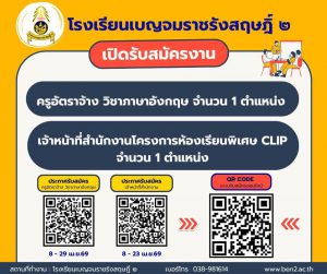 ประกาศรับสมัครครูอัตราจ้าง วิชาภาษาอังกฤษ และเจ้าหน้าที่สำนักงานโครงการห้องเรียนพิเศษ CLIP